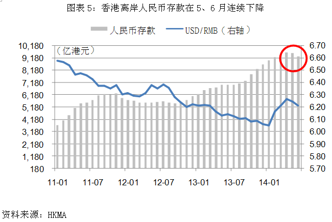 (2)在港囤积人民币待“沪港通”开启后涌入A股现象并不明显。6月份香港离岸人民币存款数据连续第二个月下降(图表5),说明对A股市场有兴趣的离岸人民币并未在香港“囤积”。综合前文所分析,这一部分的资金要么已经通过其他渠道投资A股,要么并未在近期密集流入香港。因此或不会出现囤积在港资金蜂拥而入的现象。