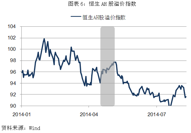 从估值角度来看,机构投资者对A股小市值的股票需求有限。A股小市值的股票估值通常相对高。从海外机构投资者的主流投资习惯看,小市值且估值高的股票很难受到追捧。然而目前A/H股折溢价率处在较低的水平,恒生A/H折价率指数在92附近(A股较H股折价约8%,图表6),是因为A股大市值高分红个股相对H股的折价率普遍在10%以上,这一折价空间虽然可以用无风险利率、投资者结构、投资理念、投资者预期以及稀缺性等因素解释,但是当前的折价率还是相对偏大,在沪港通开通后,预期折价可能有收敛的趋势。在这一预期下,会吸引套利资金进行AH折溢价套利,港股投资者可以买入折价的A股来替代原有的H股,或者可以通过买入折价的A股,同时在港股利用衍生品卖空对应的H股,可以构建套利组合。随着港股通逐步落实,资金规模不断扩大,套利交易预期会有一个小的交易高潮出现。但是在套利空间缩小后,这部分资金也会迅速流出,预期基于这一目的的跨境资金流动主要跟随套利空间的大小而波动。