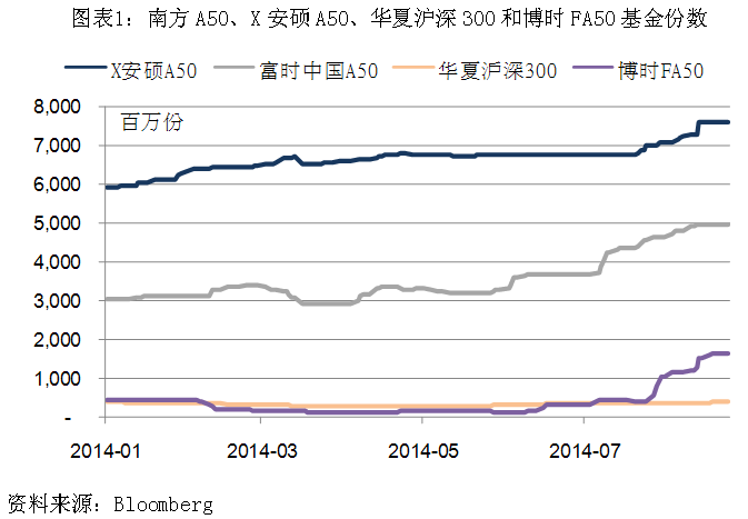 “沪港通”尚未正式启动,海外资金已经借道QFII和RQFII流入A股。从以A股为投资标的的ETF市场来看,在香港上市的南方A50、X安硕A50、华夏沪深300和博时FA50四只ETF市值较大(市值与AUM相近),截止2014年8月25日合计市值为1362亿,占到所有A股ETF市值的80%以上。四大ETF自4月10“沪港通”政策宣布之后,基金份额累计增长43亿份,市值累计增长约380亿港元。(见图表1和图表2)