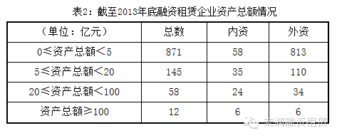 从企业经营规模上看,截至2013年底,资产总额小于5亿元的融资租赁企业共871家,资产总额在5亿元(含)至20亿元之间的融资租赁企业共145家,资产总额在20亿元(含)至100亿元之间的融资租赁企业共58家,资产总额在100亿元(含)以上的融资租赁企业共12家。资产总额前20位的公司资产总额合计占全行业的37.16%。