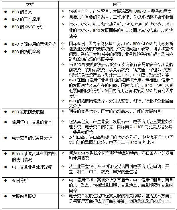 本课程主要讲述BPO 的含义、产生的背景、发展和应用的现状,以及它的工作原理、特点及与其它传统的国际结算方式比较的优劣势,它的发展前景及业务拓展策略,等等。