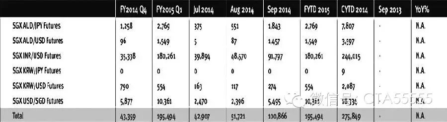 新加坡证券交易所(SGX)在2013年11月推出6个外汇期货货币对后,在今年10月20日又新增了人民币、日元和泰铢三种货币的外汇期货合约交易,分别为离岸美元兑人民币、人民币兑美元、美元兑日元和泰铢兑美元。截至目前,可交易的相关货币涉及澳元、美元、日元、新加坡纽元、印度卢比、韩元、人民币和泰铢。10月20日推出的人民币期货合约首日交易量已突破10亿人民币的关口,合约规模分别为10万美元(离岸美元兑人民币)和50万人民币(人民币兑美元期货合约)。这两种期货合约均未设每日价格限制,交易时间为新加坡时间的上午7点40分至下午6点,以及下午6点45分至次日凌晨2点,其议定大宗交易的规模为最少20手。新加坡交易所外汇期货相关品种近期的成交情况如下表所示: