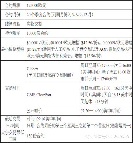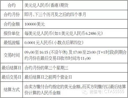 合约规则上,标准规模美元/离岸人民币(CNH)期货有期货转现货(EFRP)资格,每日收付以离岸人民币计算与计价,最终结算通过CME清算所 批准银行于合约月份第三个星期三(如果为公共假期即顺延到下一交易日)采用以下方式进行:由空方向多方交割10万美元(标准合约)或1万美元(电子微型合约);与之相对,多方向空方交割相当的离岸人民币价值。CME清算所通过中止从多空双方收取支付委托来禁止离岸人民币对美元的支付。下表以欧元/美元为代表展示其合约的一般内容: