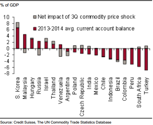 下图显示了新兴市场诸国的经常帐户对大宗商品价格下跌的敏感程度,以及受到的正面或负面影响程度: