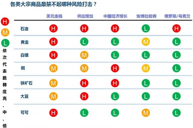 1,对石油来说,美元走强、供应增加、中国经济增长,以及俄罗斯和乌克兰的地缘政治风险,都是最难以抵御的风险因素;2,对黄金、白银和可可而言,最难以抵御的都是美元走强;3,对于铜而言,最大的风险来自中国经济增长;4,对于铁矿石来说,最禁不起供应增加和中国经济增长方面的打击。5,而大豆最大风险是供应增加。