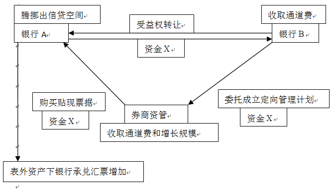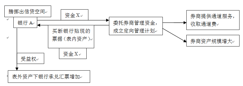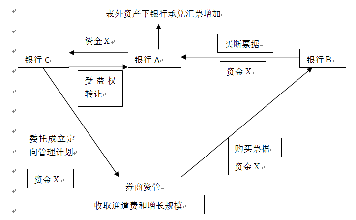 流程:银行C将自有资金X委托券商资产管理部门成立定向资产管理计划,券商定向资产管理计划用于购买银行B的票据资产(同时银行A已将自己的票据转让给银行B),银行C将拥有的资产管理计划受益权转让银行A。
