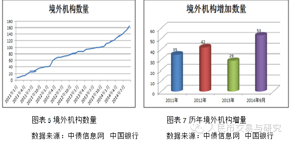 从境外机构在境内金融市场的开户数量来看,考虑到境外央行,截止至2014年9月底,在中债登的开户数量已经达到164家,比2013年底111家 增加了47.7%。从历年新增的境外机构投资者数量来看,今年投资者新增 数量比以往有了明显的提升。