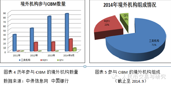 截止至2014年9月底,已有125 家包括港澳清算行、境外参加行、境外保险机构、RQFII和QFII等境外机 构获准进入银行间债券市场,境外机构投资者数量较2013年底增长23%。 其中共有87家境外参加行以及清算行,投资者数量较去年年底增长近9%; 共有30家RQFII已经获得到人民银行批复,比2013年底增加了43%;8家QFI I成为首批参与到银行间债券市场的合格境外机构投资者。