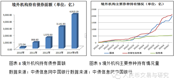 从中债登提供的数据中显示,2014年9月底,境外机构投资者参与银行间 债券市场所持有的债券总面额达到了4,910.19亿,比2013年底的3,141.3 9亿元,增长了56.3%。持有债券的数据保持着强劲的增长势头。