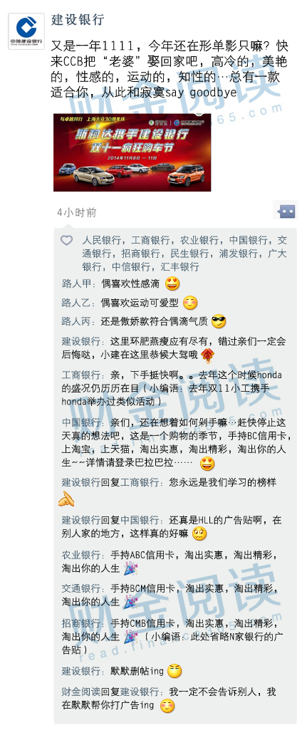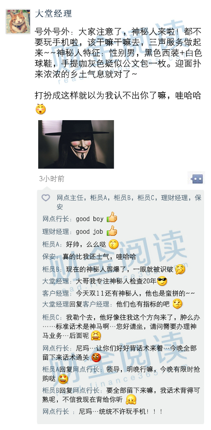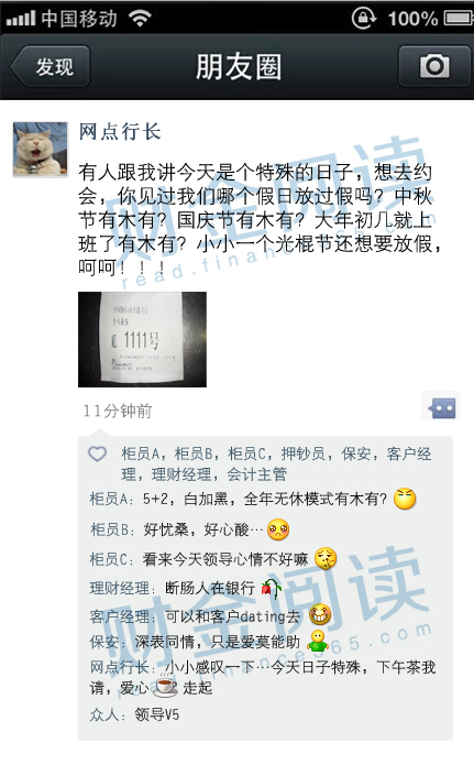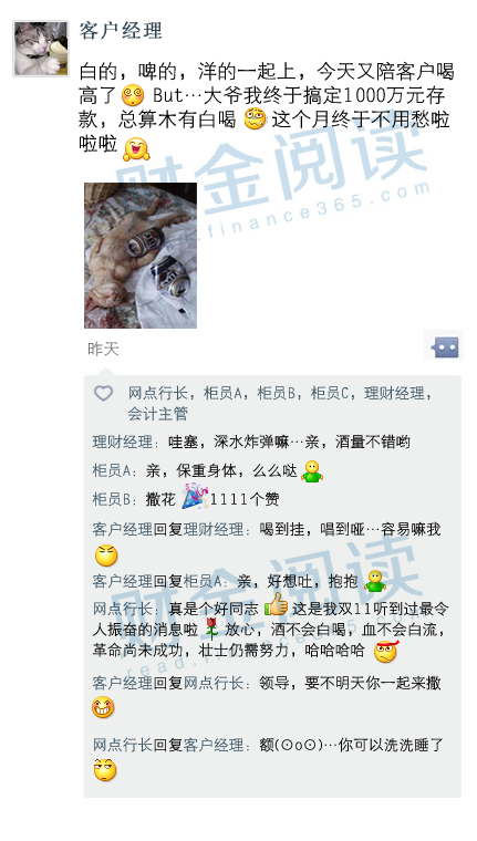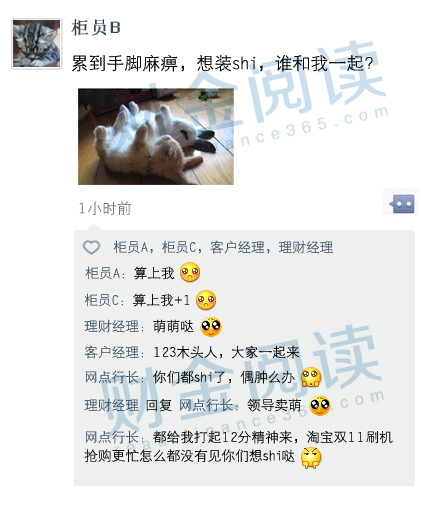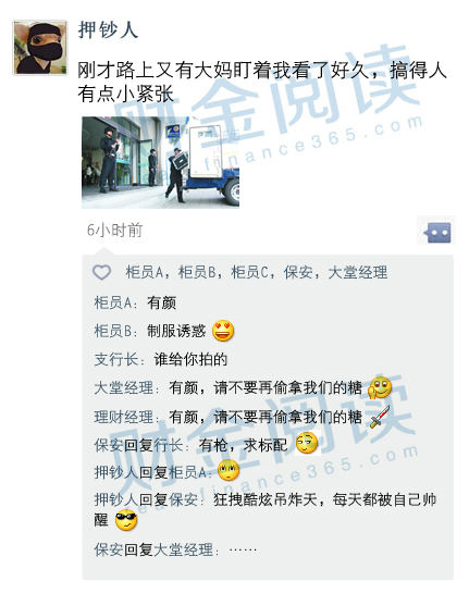 行长卖萌,柜员吐槽,大堂经理站岗,理财经理打广告,保安上进,押钞人耍帅,客户经理买醉,另有神秘人番外篇以及各大银行幽默帖。且看11.11这一天,银行网点朋友圈热闹景象。