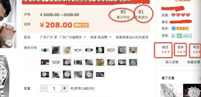步入正题,比如,在淘宝搜索框输入『手表』,进入这么一款商品的主页。普通网购者,通常会看这么几点:描述、服务、物流指标数据,商品评价,商品描述,成交记录。