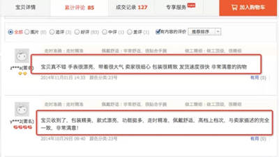从图例中,我们可以看到,这款商品的描述、服务、物流指数都全线飘红,为4.9;评价也相当不错,共有85条带字评论,其中好评83,中评1,差评1,追评3;至于描述,自然和大部分淘宝商品一样,十分之好;成交记录显示,每天都有5-6单的成交量。