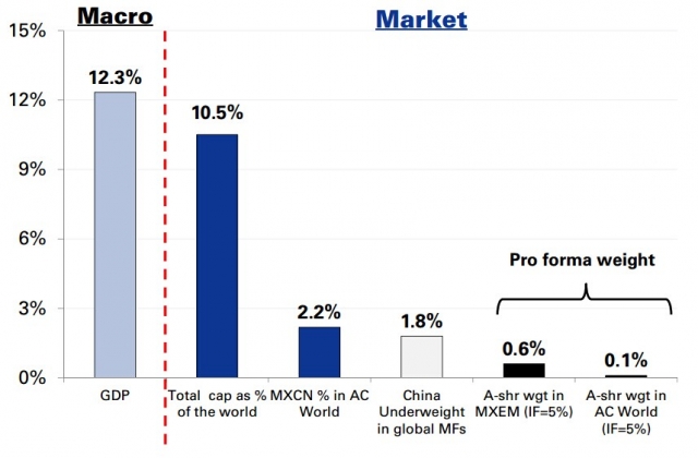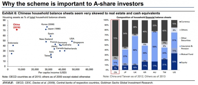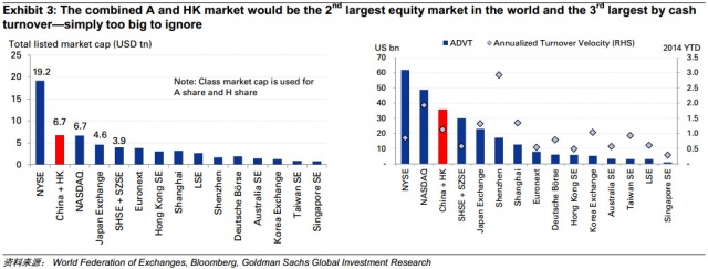 高盛在报告中称,沪港通是前所未有的机会。它创造了一个市值/交易量在全球排名第二/三的 “中国”市场。它还指出,从韩国和台湾的经验看,A股可能会很快被纳入全球基准股指。