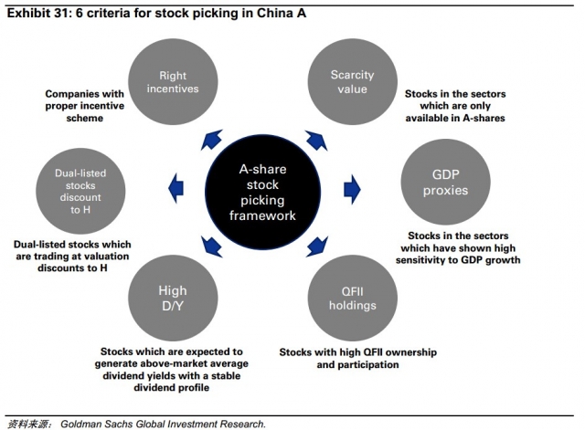 一、挑选A股的六大标准:稀缺价值、对GDP增长的敏感性、QFII持仓、较高/稳定的收益率、AH股折价股和恰当的管理层激励机制。