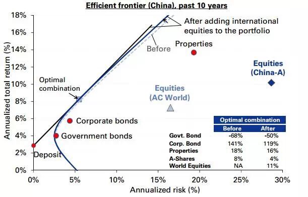 上图显示,对于A股投资者来说,加入国际市场之后,资产配置最优组合中A股投资比例由之前的8%下降到4%,而国际市场权益比重则由0增至11%。