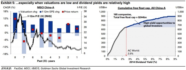 上图右还显示,目前股息率超过世界平均水平2.5%的A股公司有165家,流通市值达2440亿美元。