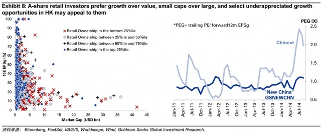 如图所示,散户更集中于投资中小盘股(0-50亿美元)和成长股。香港新兴行业(GSNEWCHN) 的PEG估值相对中国创业板(Chinext)的估值更合理,也更有吸引力。