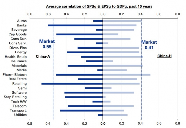 如图所示,过去10年的数据显示,A股市场与GDP增长的相关系数为0.55,大于H股的0.41。