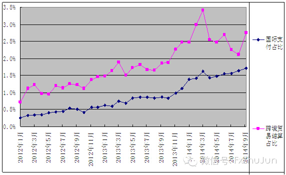 人民币跨境贸易月度结算占比与国际支付占比比较(2012年1月到2014年9月),《人民币国际化和产品创新》第五版图17.2。