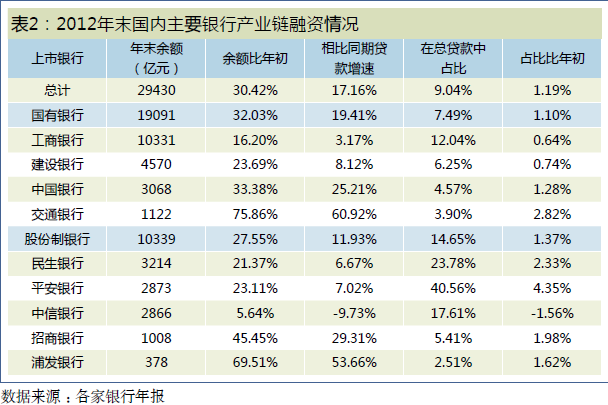 目前,国内各家商业银行也逐渐对供应链金融业务加强了资源投入,希望通过业务模式的调整来促进转型,降低其对存贷业务利差的依赖。2012年末,9家上市银行供应链金融融资余额合计2.94万亿元,比年初增长30.42%,其中:4家国有银行的融资余额合计1.91万亿元,5家股份制银行的融资余额合计1.03万亿元,分别较年初增长了32.03%和27.55%(见表2)。