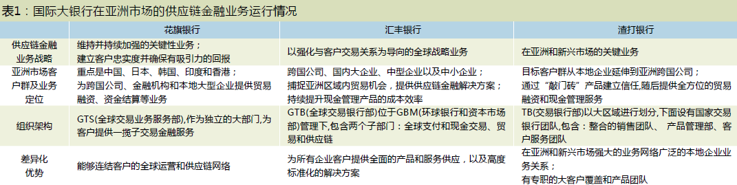 站在全球范围的角度来看,在金融危机最严重的2008年,商业银行的收入几乎减半,而与之形成鲜明对比的是,供应链金融的收入却在同期增长了17%,从3040亿美元提高到3540亿美元。同时,一些国际大型银行纷纷确立了全球供应链金融的业务战略、客户定位、组织架构和差异化能力优势(见表1)。