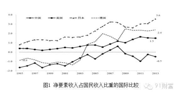 一个国家的对外资产和负债结构很大程度上决定了其净要素收入,其中主要是本国在国外的投资收益减去其他国家在本国获得的投资收益。图1是净要素收入占国民收入比重的国际比较。该图显示,我国的净要素收益占国民收入的比重长期以来在零左右徘徊。也就是说,虽然我们外汇资产总量很大,远大于我们的对外负债,但是我们总资产和总负债所产生的收益的流入和流出基本上持平。而图中其他大国的要素净收益占国民收入的比重比我们大得多,比如美国是1.5%、德国为2.4%、日本为3.6%,说明他们在国际上以钱生钱的能力远远高于我们。