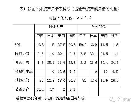 从对外资产负债表角度来看,中国国际投资头寸表及构成,显示了中国整体对外资产和负债的状况(见表1)。在2013年我国对外资产当中,储备资产占到65.4%,非储备资产(笔者在本文中将其称为民间持有的对外资产)大约有30%多。