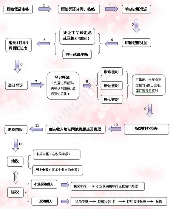 对于刚刚步入会计职场的新人,常常会为如何开始新工作而发愁,毕竟,书本上的理论,跟实际中的业务还有一定的差别,有很多的细节需要学习和掌握。对于初做会计的新人来说,首先要对会计工作的基本流程有一个清晰的了解,进而再对各个环节的业务做进一步的认识和学习。以下是对会计实务工作进行的流程化整理,让我们一起看看会计工作的12步路如何走吧!