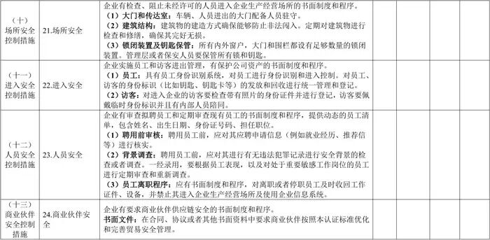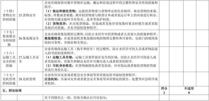 本认证标准分为内部控制、财务状况、守法规范、贸易安全和附加标准,共5大类18条29项。其中前4类为基础标准,第5类为附加标准。