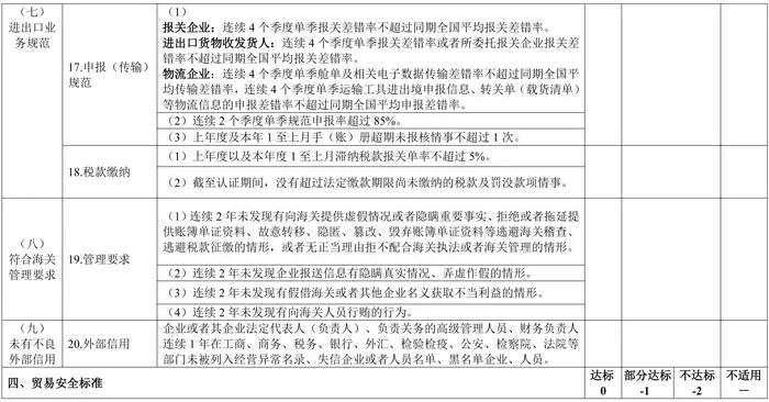除本认证标准第9、10、11、12、14、19、20项外,其他项不达标或者部分达标的,允许企业规范改进。规范改进期限由海关确定,最长不超过90日。根据规范改进情况,海关认定是否通过认证。