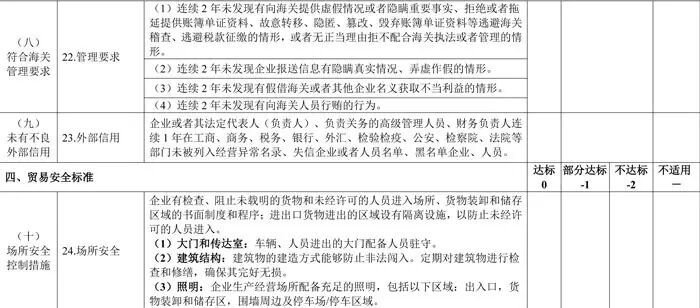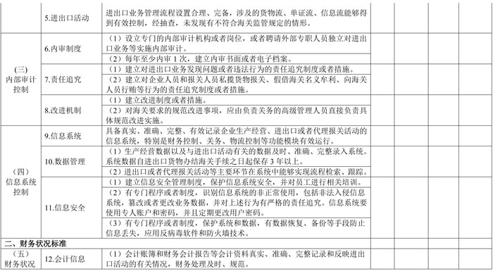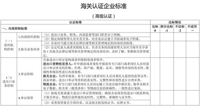 一、关于认证标准的分类 本认证标准分为内部控制、财务状况、守法规范、贸易安全和附加标准,共5大类18条32项。其中前4类为基础标准,第5