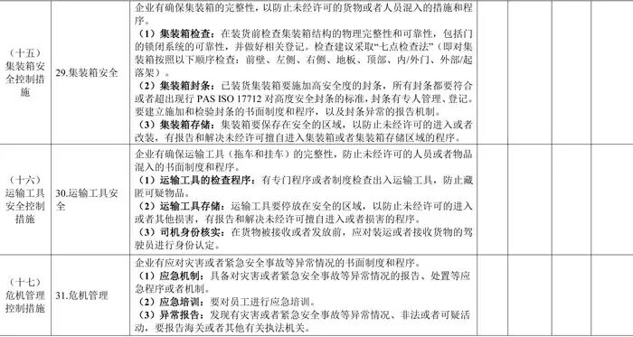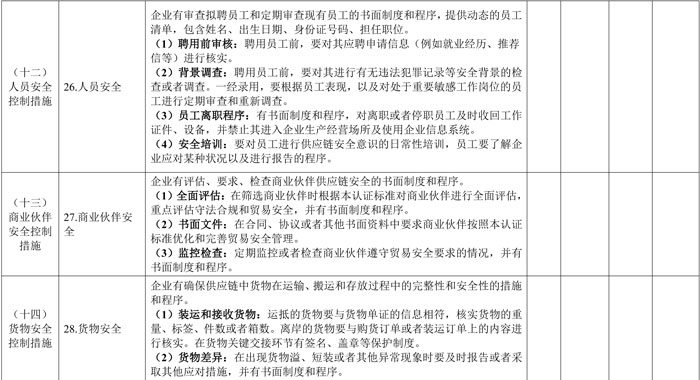 本认证标准分为内部控制、财务状况、守法规范、贸易安全和附加标准,共5大类18条32项。其中前4类为基础标准,第5类为附加标准。