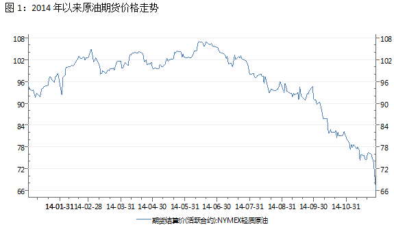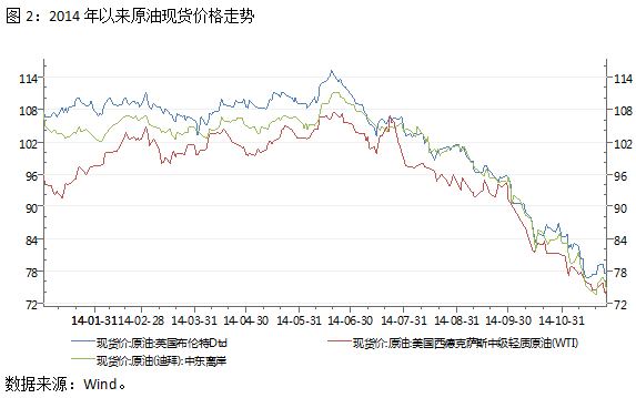 ( 2014年11月27日,石油输出国组织(OPEC)会议决定将维持3000万桶/日的配额上限,不减产。次日,NYMEX轻质原油期货价格跌破70美元/桶至66.15美元/桶。至此,国际油价较6月13日的年中最高点106.91美元/桶已经下跌了38%(图1)。原油现货价格也有类似的跌幅(图2)。