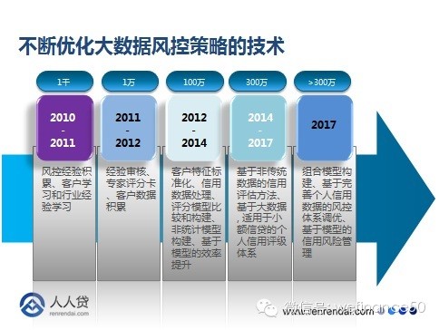 大数据在目前而言还是相对抽象的一个名词。大数据对样本数量有较高的要求。人人贷现行的模式,是在传统的审批方式上引入了评分卡和决策引擎,是一个信贷工厂的模式。但是信贷工厂的模式对数据的要求非常高;人人贷一直主动要求与央行征信公司接触,但是中国目前的现状是央行下属征信公司和管理局是平行机构,征信公司负责征信领域,而管理局则负责牌照的发放,这导致了沟通工作难以进行,所以暂时很难推动这个征信市场。