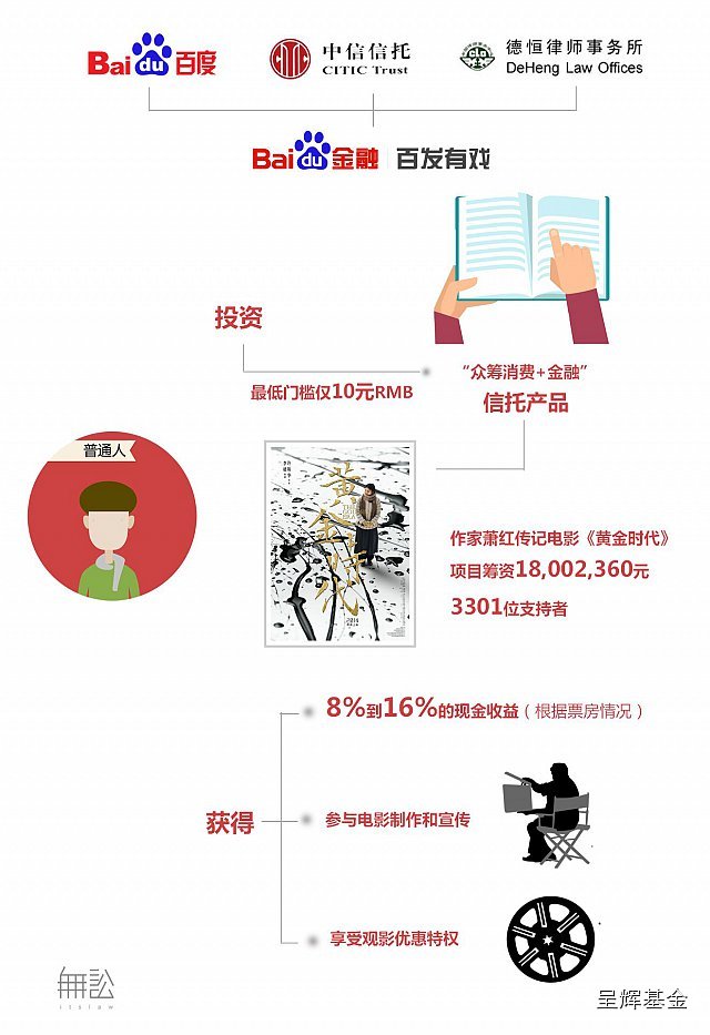 案例二:百度 "百发有戏 "+《黄金时代》9 月,百度联合中影股份、中信信托和北京德恒律师事务所发布 "百发有戏 ",定位为 "众筹消费 + 金融 "的信托产品,最低门槛仅 10 元人民币,用户可获得电影票等权益,并根据票房情况有可能得到 8% 到 16% 的现金收益。该产品的背后是中信信托成立的消费信托,将用户的消费权益变成收益权。" 百发有戏 "特殊之处在于,它并不只是将百度当作一个渠道,而是创造了一个全新的投资模式:让用户在消费的同时进行理财,理财的同时进行消费,且两者可以相互刺激。