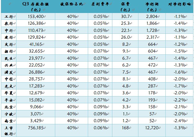 由于差别费率的具体标准仍需报国务院批准执行,假设过渡期内大行、股份行、城商行的差别费率分别为0.05%、0.07%、0.09%,50 万以内存款金额占总存款的比例为40%,测算结果显示存款保险制度对上市银行净利润的负面影响在1-2%之间,平均影响为1.3%。