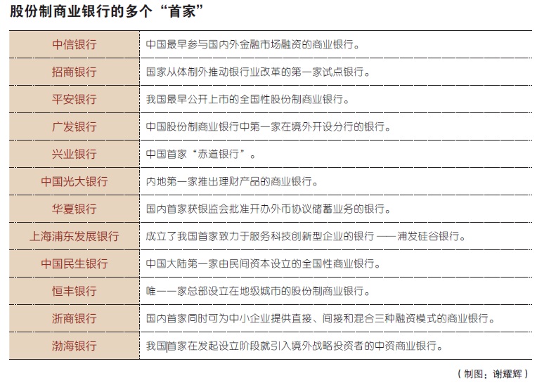 “作为我国金融体制改革深化和金融领域逐步市场化的产物,股份制商业银行从诞生之初,在股权结构、治理机制、经营管理等方面就曾有诸多突破和创新,在银行业改革大潮中,多次扮演‘试验田’的角色,在很多领域成功地激发整个银行业的市场活力。”