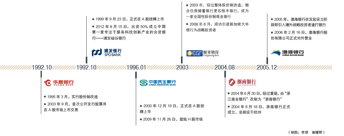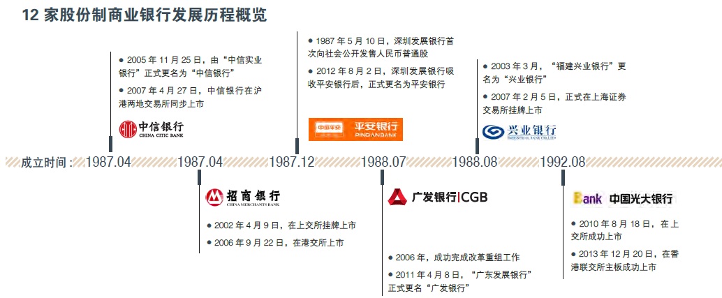 1987年4月,在我国改革开放的发源地 —— 深圳特区,招商银行正式对外营业。随后的两年时间,中信实业银行(2005年更名为中信银行)、深圳发展银行(2012年更名为平安银行)、福建兴业银行(2003年更名为兴业银行)、广东发展银行(2011年更名为广发银行)陆续成立。