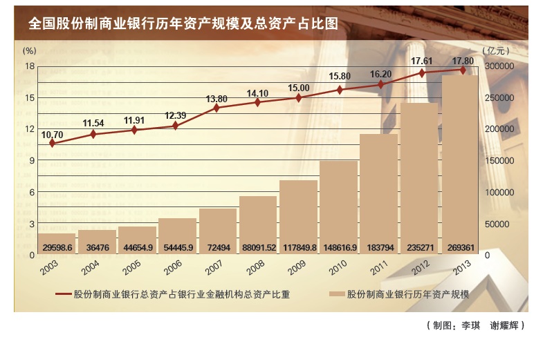资产快速增长的背后是市场份额的持续扩大。据中国银监会副主席阎庆民介绍,截至2014年6月末,全国股份制商业银行占银行业金融机构资产总额的18.5%,较十年前提高了4.4个百分点。