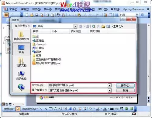 各位帅哥美女们注意啦,这一步是非常非常重要的!许多朋友设计好了之后是直接点保存的,但这是错误的,这样保存下来的文件不是PPT模板文件。正确的方法是: 在菜单栏,选中“文件”–“另存为” ,在打开的界面中进行如下设置:保存位置,可以放在桌面,“文件名”在这里暂定义为“如何制作PPT模板.ppt”。“保存类型”请选择“演示文稿设计模板”,然后点保存。接下来你可以返回到桌面看一下这个文件的图标和扩展名,发现了吗? 它的图标跟一般PPT的图标是不一样的,同时它的文件和扩展名是“如何制作PPT模板.pot”