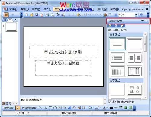 PPT模板是制作完成啦,如何使用这PPT模板呢?别急,接下来我们新建一个空白的PPT文件,这时你有没有看到PPT界面的右侧上方,有没有一个区域,显示的是“幻灯片版式”其下面有“文字版式”、“内容版式”等。如果你没有发现这个区域,那么,请在 菜单栏 打开“格式”—“幻灯片版式”选项。