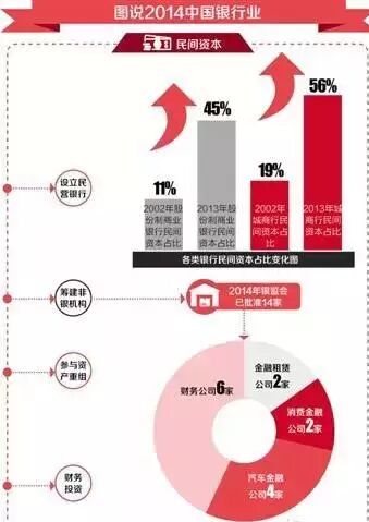 银监会始终坚持科学审慎、公平公正和同等待遇原则,对各类资本进入银行业一视同仁,并不断完善准入监管政策。一是民营银行试点改革取得实质性进展。经国务院 批准,2014年3月11日公布首批5家民营银行试点发起人名单。7月和9月先后两次批准5家试点民营银行筹建,12月12日已批复1家民营银行开业。目 前银监会正在研究制定关于促进民营银行发展的指导意见,已开始在有条件、有意愿的省(市)开展扩大试点工作,并将重点考虑东北、中西部等金融服务薄弱地 区。二是鼓励民间资本通过发起设立、认购新股、受让股权、并购重组等多种方式入股中小银行等金融机构。在股份制商业银行和城商行方面,民间资本占比由 2002年末的11%和19%提高到2013年末的45%和56%,民间资本占比超过50%的中小银行已有100多家。在农村中小金融机构方面,民间资本 在农村合作金融机构占已达到90%,在村镇银行占比超过72%,2014年新增108家民间资本占主导地位的村镇银行。三是鼓励民间资本投资设立非银行金 融机构。修订发布《金融租赁公司管理办法》和《消费金融公司试点管理办法》,新增12个消费金融公司试点城市,新批准14家民营企业筹建金融租赁、消费金 融、企业集团财务公司等非银行金融机构,民间资本控股的非银行金融机构将达到55家。