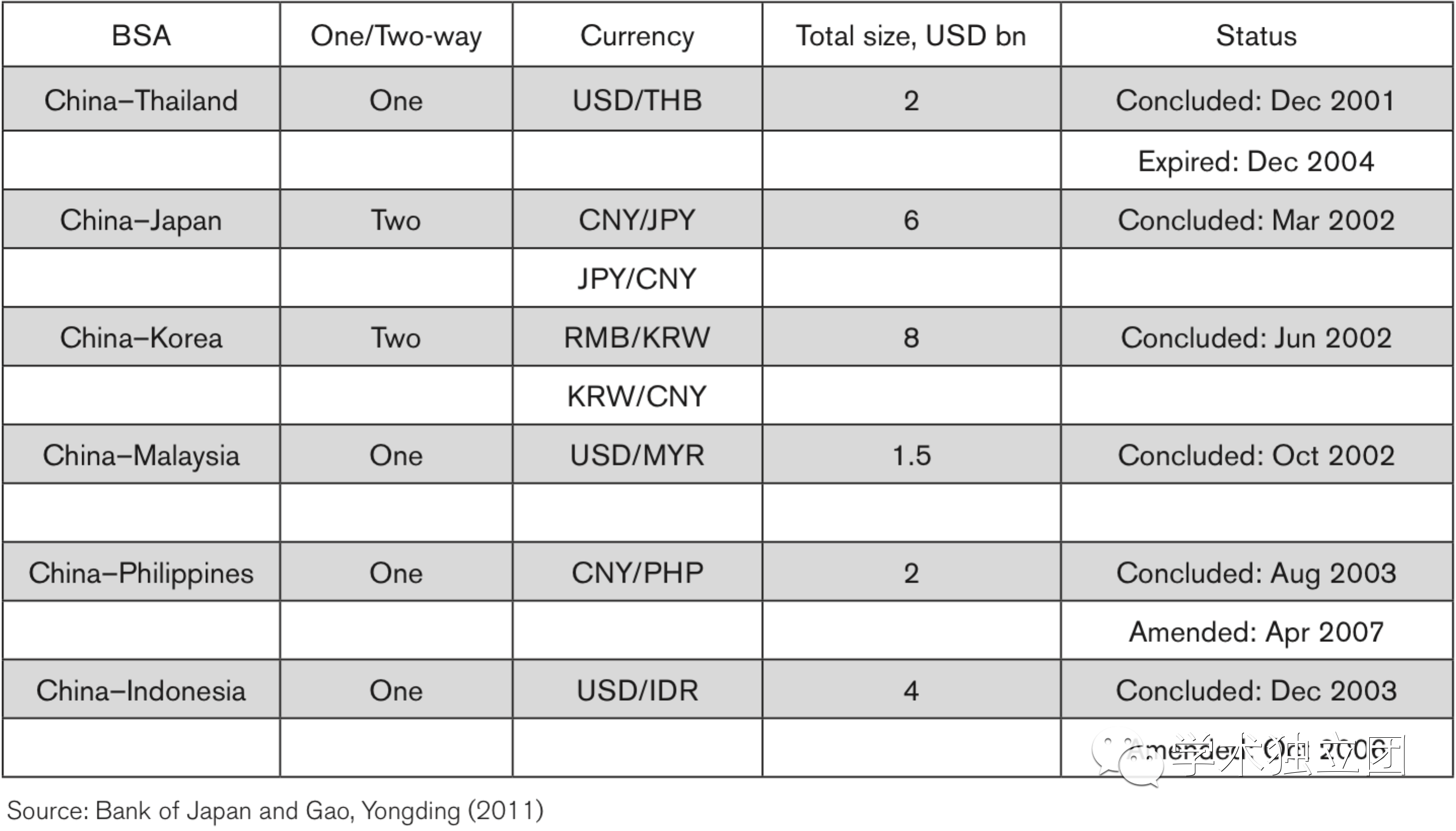 表1. 双边互换安排:中国和其他“东盟十加三”国家(截至2007年7月)