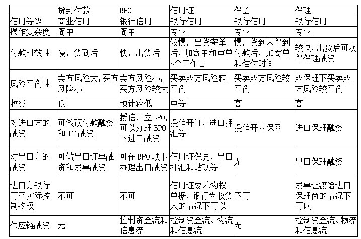 BPO的作用主要是可在其下设计多种融资产品,加快收付汇速度,为客户提供更合适的服务,也可用于供应链融资的流程设计中。但目前银行已经在货物贸易下为客户提供了多种结算方式,衍生出多种融资产品,这些产品具有各自的特点,以国际结算及贸易融资产品为例,比较如下表。另外BPO也可以用于国内贸易结算和融资,原理相同,但替代产品更增加了银行承兑汇票。