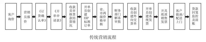 广东石油原有成品油销售模式为:客户经理接到客户订单,需前往公司开票点,填写纸质《开单申请表》,开票点根据《开单申请表》创建ERP销售订单,经过价格和货款资金审批后,方能开出订单及电子提油卡,交客户前往油库提油,整个业务流程如下图所示。
