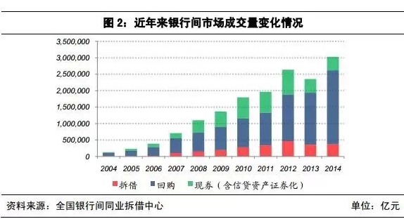 2014年,银行间市场拆借、现券和债券回购累计成交302.4万亿元,同比增加28.5%。其中,银行间市场同业拆借成交37.7万亿元,同比增加6.0%;债券回购成交224.4万亿元,同比增加41.9%;现券成交40.4万亿元,同比减少3.0%。