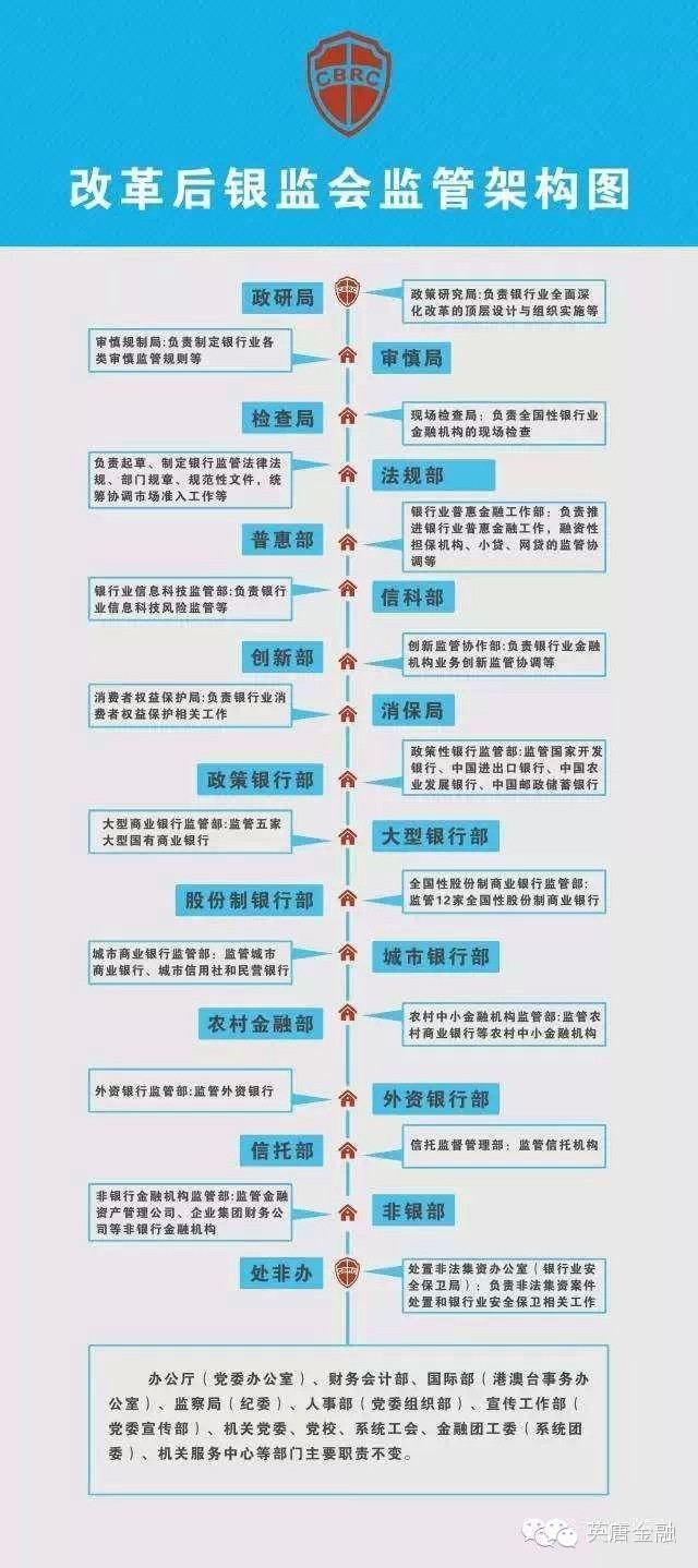 此前,对股份制商业银行、城商行、民营银行等监管统一在银监会银行二部;而信托机构、金融租赁公司等非银机构监管统一在银监会非银部。
