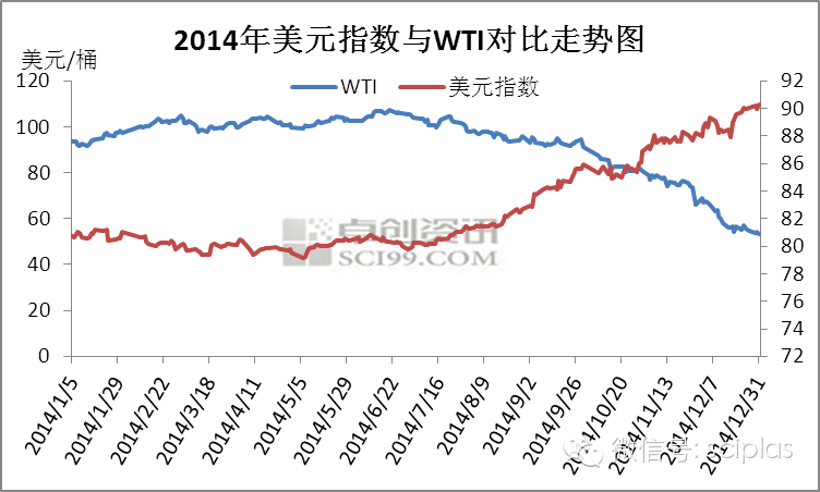 那么为什么说美元升值才是原油暴跌的根本因素呢?首先,我们从上图可以清晰的看出美元指数与WTI原油呈现明显的负相关性,通过相关性系数的计算,2014年全年的相关性系数在-93.99%,自14年6月至年底,其相关性系数高达-95.33%,均表现出较强的相关性,表明美元指数对WTI原油产生较强的影响。所以,我们说,美国利用美元绑架了国际原油,成为国际结算货币,从而绑架了全球的经济。