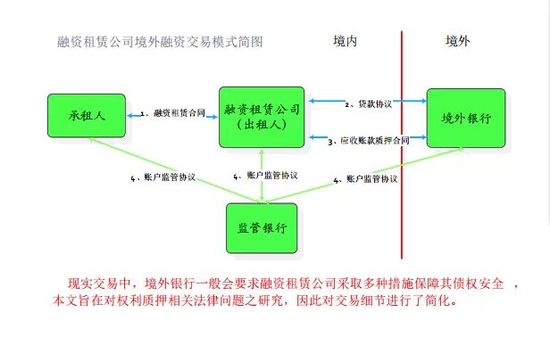 通过融资租赁公司引入境外资金,投资实体经济,可以有效解决境内企业融资难、融资贵的难题。然而,在当下我国应收账款质押法律体系不是很完善的情况下,境外银行对其权益是否可以受到法律的保护尤为关注。下面我们以简化的融资租赁公司境外融资交易模式来分析我国应收账款质押制度的有关问题,并提出建议期望予以完善。