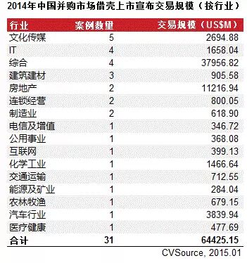 表3 2014年中国并购市场借壳上市宣布交易规模(按行业)